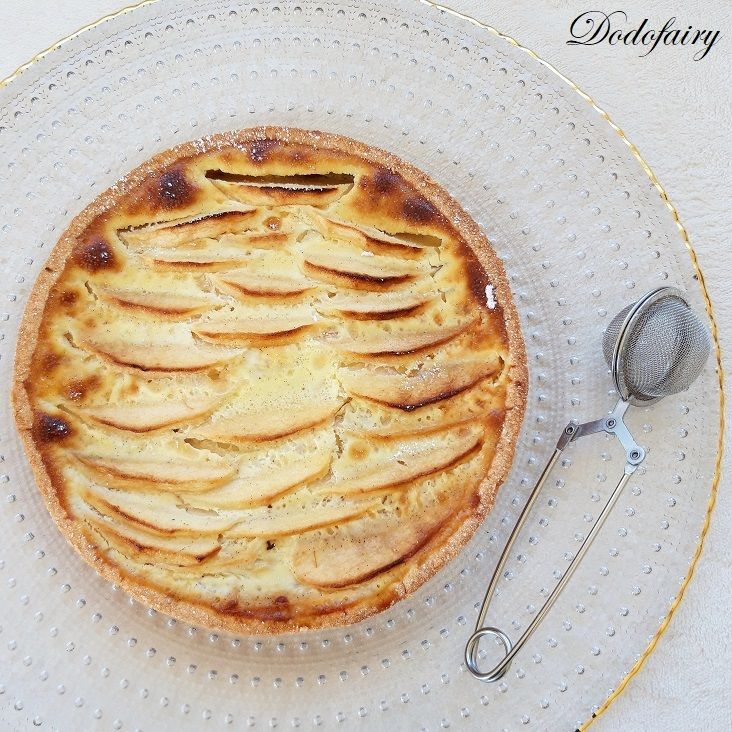 Cette tarte se compose d'une pâte sucrée, d'un appareil à crème prise sucrée et de pommes (je vous conseille d'utiliser des pommes sucrées qui cuisent rapidement au four).